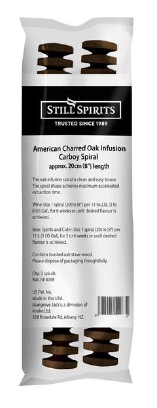 Infusion spirals provide simple and fast extraction of oak aroma and flavour at a fraction of the price of a barrel. They are also really easy to add to bottles or a carboy and remove afterwards, there is no need to filter out chips.